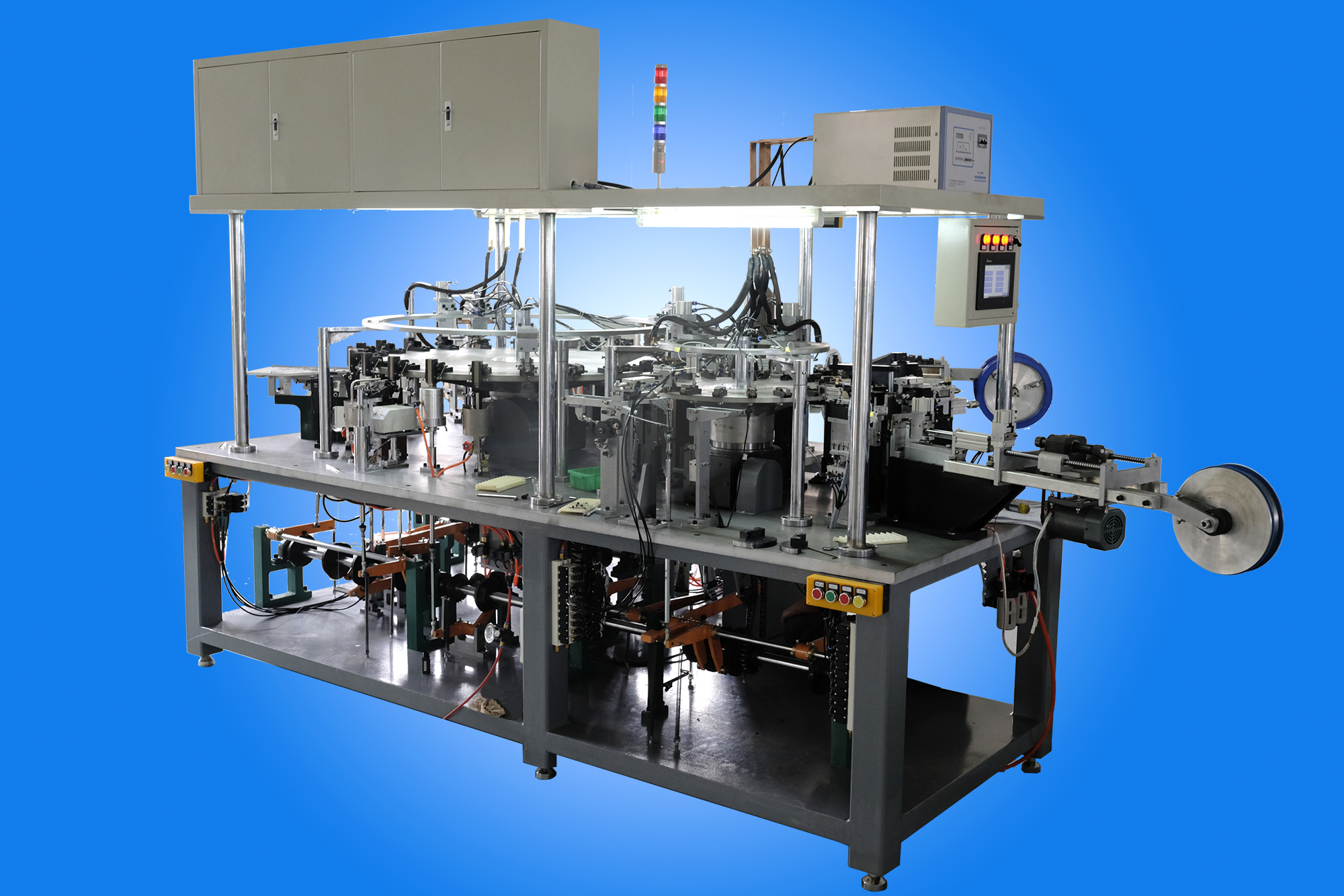 鉬桿校直→U型→U型焊接鉬片→雙鉬桿校直對接→燒夾玻璃芯柱→接鎳絲→鎳絲打鉤→掛燈絲(可選自動或手動上燈絲)→燈絲整形→燈絲預(yù)熱→上電子粉→烘干→自動卸料(料盒或傳輸帶)